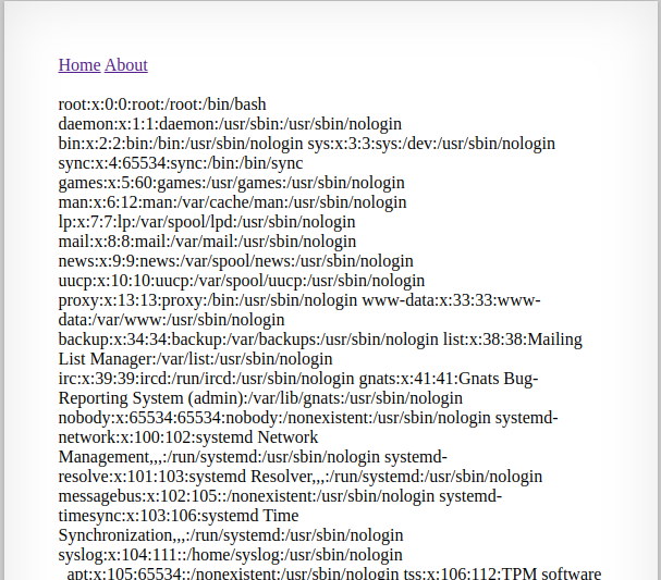 Nada más entrar a la web vemos dos opciones home y about al hacer clic en cualquiera de ellas vemos como carga la página y en la url tenemos un nuevo parámetro page=home, esto parece un LFI. Pruebo a cambiar home por /etc/passwd y …